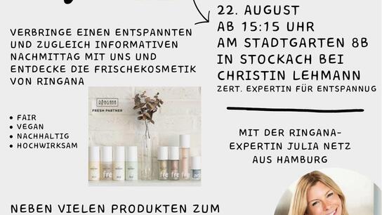 Hier erfährst Du alles zum Thema Hautpflege mit der frischen und natürlichen Kosmetik von Ringana. Wir starten am Sonntag den 22.9.24 um 16 Uhr in Hamburg Eppendorf statt (Im WeiterWerk, Lehmweg 40, 20251 HH). Wir erzählen im Team alles Wichtige über die 4 Schritte in der Hautpflege und schauen uns die Produkte genauer an. Natürlich gibt es wie immer Chi-Secco und kleine Snacks. Bitte schreibe uns über Membado eine Nachricht wenn Du dabei sein willst, damit wir Dich vorab registrieren können. Bis zum 22.9.24